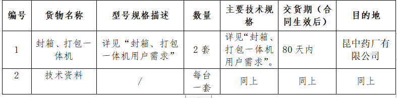 昆明中药厂有限公司封箱、打包一体机设备采购招标公告