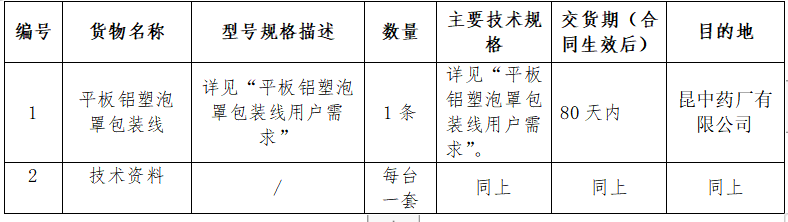 昆明中药厂有限公司平板铝塑泡罩包装线设备采购招标公告